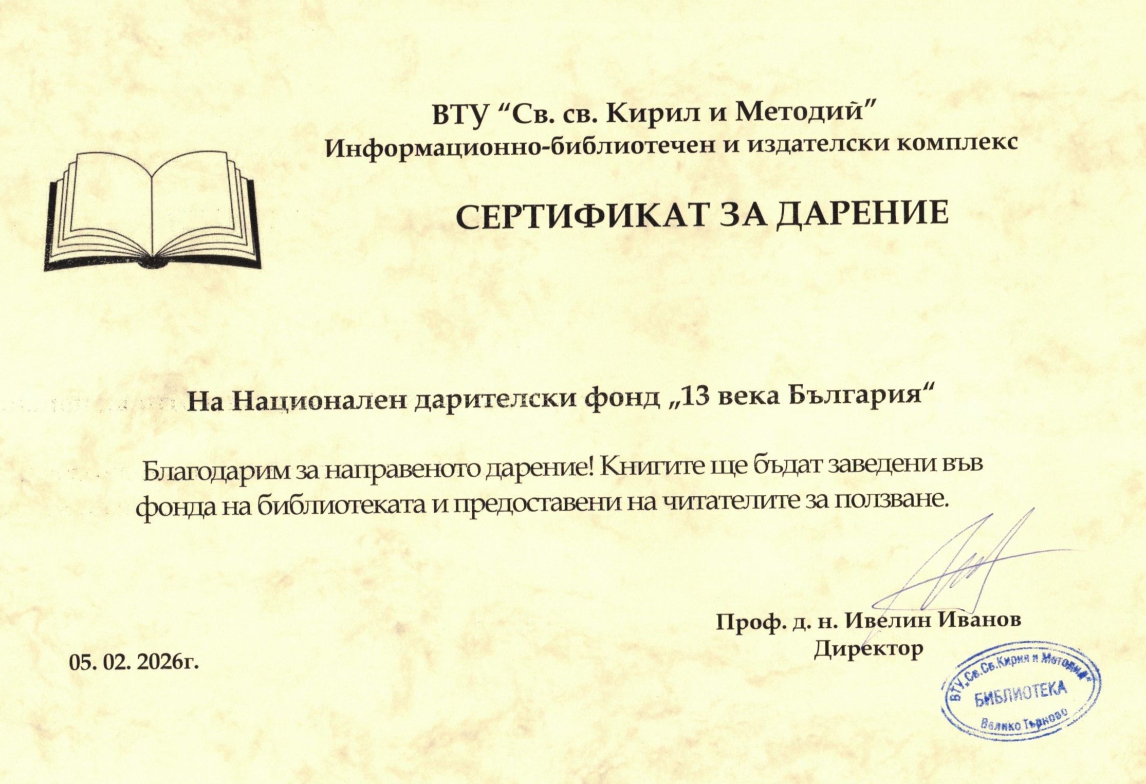 На 12 февруари 2026 Националният дарителски фонд „13 века България“ направи дарение от книги на Великотърновския университет „Св. Св. Кирил и Методий“.